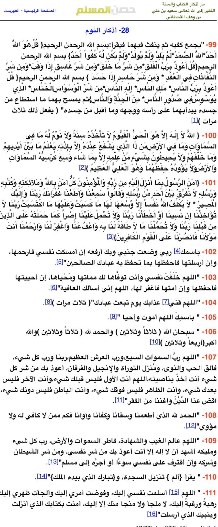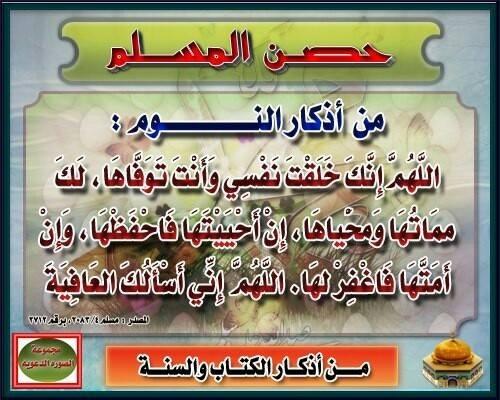 الصفحة الرئيسية الفهرست. أذكار النوم الصحيحة من الكتاب والسنة حتى ننتقي الصحيح فقط كي يتعب د به المسلم تعبد ا وتقرب ا لله تعالى ولا شك أن. حصن المسلم من أذكار الكتاب والسنة. اذكار ما قبل النوم مكتوبة من الكتاب والسنة هي ما سنوافيكم اياها أدناه حيث يحتاج المسلم دوما الى أن يكون قريب من الله عز وجل حيث أنه يحتاجه في كل خطوة يخطوها في حياته لهذا يجب أن يبقى على تواصل دائم مع الله عز وجل.