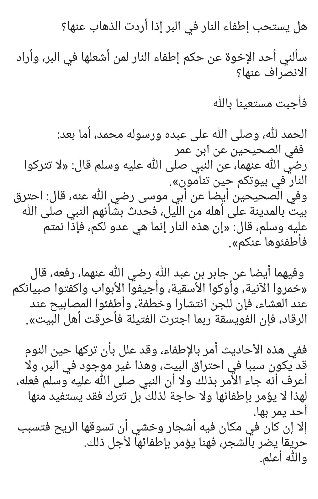 ما حكم إطفاء النار عند النوم