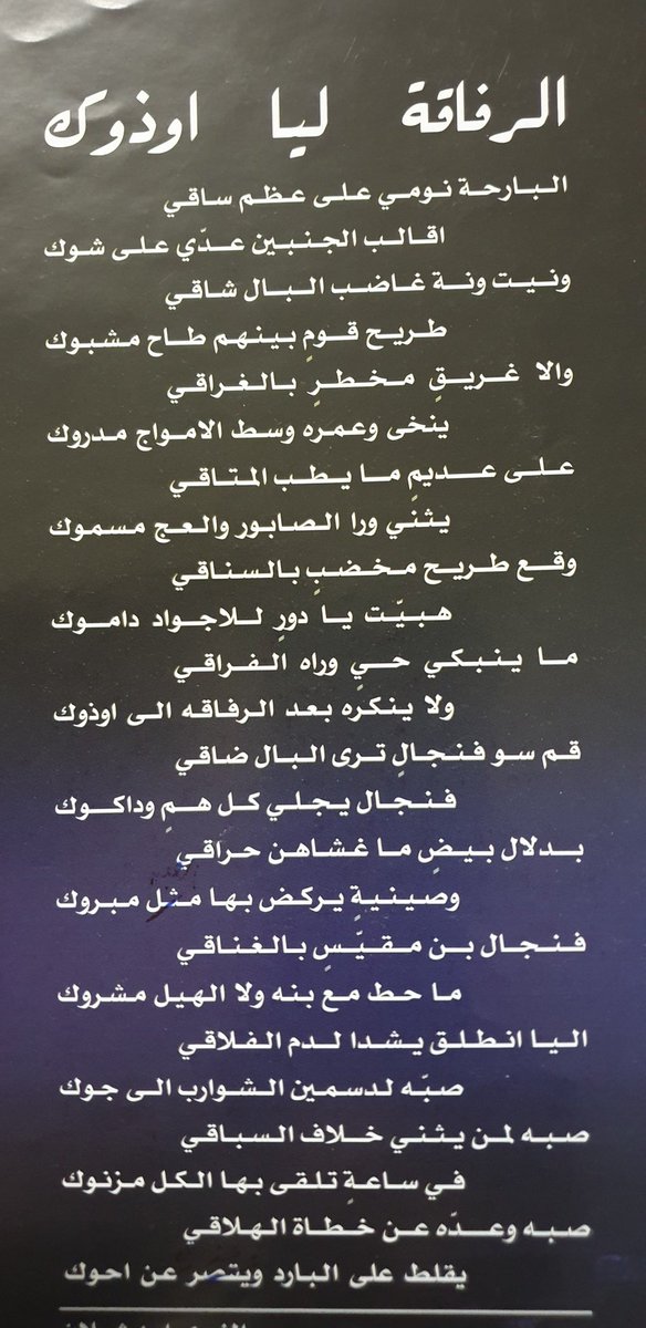 عظم رقبة ما هي عزوة حلايف قبيلة ماهي بـ لفو ملزاه يشهد لها بالطيب كل الطوايف. البارحة نومي على عظم ساقي. والا غريق مخطر بالغراقي. اقالب الجنبين عدي على شوك.