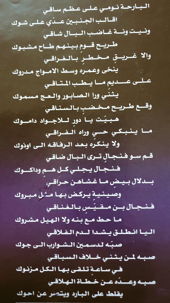 البارحه نومي على عظم ساقي. قصيدة الشيخ النوري الشعلان اليتيمه البارحة نومي على عظـم ساقـي اقالب الجنبين عدي علـى شـوك. على عديم ما يطب المتاقي. اقالب الجنبين عدي على شوك. مسجات منوعة شوق ورومنسية مسجات منوعة وان شاء الله تعجبكم وابيكم تقولون لي وش اكثر المسجات اللي عجبتكم جيتك من الغربة اسابق حنيني جيتك ادور حب صافي بلا قياس جيتك بقايا انسان والشوق فيني الصفحة 1.