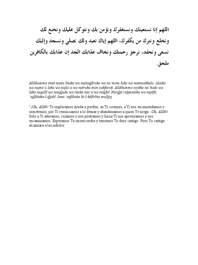 الل ه م إن ا ن س ت ع ين ك و ن س ت غ ف ر ك و ن س ت ه د يك و ن ؤ م ن ب ك و ن ت و ك ل ع ل ي ك و ن ث ن ي ع ل ي ك ال خ ي ر ك ل ه ن ش ك ر ك و ل ا ن ك ف ر ك و ن خ ل ع.