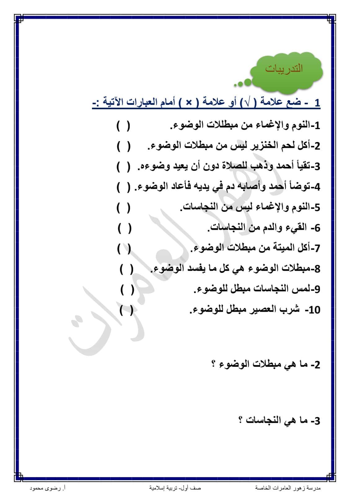 شرح درس مبطلات الوضوء للصف الأول