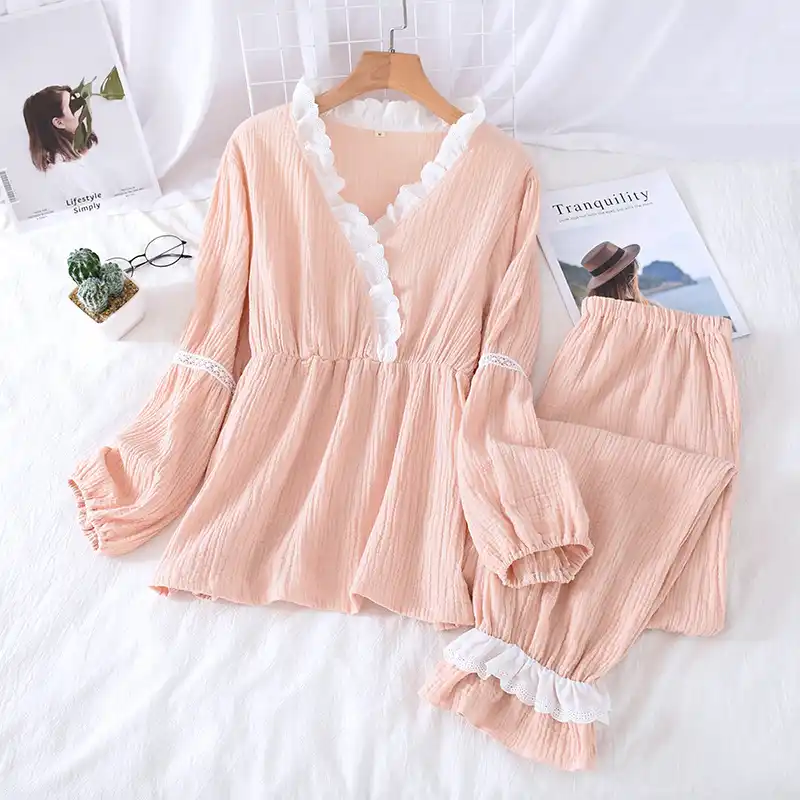 ملابس نسائية صيفية منسوجة من القطن ملابس منزلية من الدانتيل خياطة ملابس نوم بنطلون بأكمام طويلة طقم بيجامات ملابس نوم طقم بيجاما فيمينينو