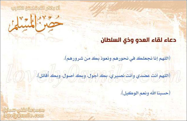 36 دعاء لقاء العدو وذي السلطان. وضمن أذكار اليوم والليلة يوجد في كتاب حصن المسلم دعاء يقوله من تقلب ليلا من الكتاب والسنة الأول لا إله إلا الله الواحد القهار رب السماوات والأرض وما بينهما العزيز الغفار ونص الدعاء قريب من آية رقم 66 في سورة ص وجزء. 126 ما يقال عند الفزع.