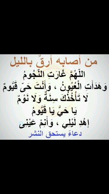 شكوت إلى رسول الل ه صلى الل ه عليه وسلم أر قا أصابني فقال ق ل الل ه م غار ت الن ج وم و ه دأت الع ي ون وأن ت ح ي ق ي وم لا ت أخ ذ ك س ن ة و لا ن و م يا حي يا.