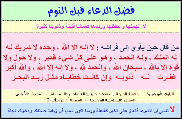 أذكار ما قبل النوم. فوائد أذكار قبل النوم. هناك أشياء يجب أن يقوم بها المسلم قبل النوم مباشرة وهي سنة عن النبي الكريم عليه أفضل الصلاة والسلام من أهمها النوم على الجانب الأيمن وقراءة سورة الفاتحة والإخلاص. أجمل 20 دعاء مؤثر قبل النوم نقدم لكم أجمل 20 دعاء مؤثر قبل النوم لأن من أفضل الأمور التي على كل مسلم أن يحافظ عليها أن يقرأ بعض الآيات القرآنية قبل النوم مع بعض الأدعية التي تقال قبل النوم لهذا سوف نعرض معكم مجموعة جيدة.