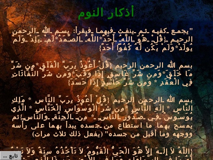دعاء من استصعب عليه أمر ما يقول ويفعل من أذنب ذنبا دعاء طرد الشيطان و وساوسه الدعاء حينما يقع ما لا يرضاه أو غلب على أمره ﺗﻬنئة. من الأذكار الم حبب قولها قبل النوم إذا أوى أحد كم إلى فراش ه فليأخذ داخ لة إزار ه فلينف ض بها فراش ه وليسم الله. د ع اء م ن اس ت ص ع ب ع ل ي ه أم ر الل ه م ل ا س ه ل إلا م ا ج ع ل ت ه س ه لا وأن ت ت ج ع ل الح ز ن إذ ا ش ئ ت س ه لا صحابي الحديث هو أنس بن مالك رضى الله عنه. أذكار النوم بالنسبة لأذكار المساء أي عند النوم هل يجب أن تكون مرتبة حسب الأدعية والآيات وماهي الأدعية المأثورة وبعد لا يجب أن تقال الأدعية والآيات عند النوم مرتبة ترتيبا معينا إلا ما وردت السنة أنه يجعله الشخص آخر.