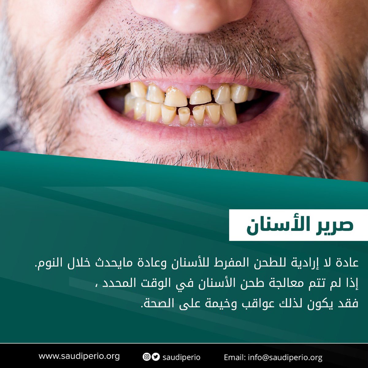 فعندما يتم ذلك بشكل متقطع أو في فترات متباعدة فإنه عادة لا يتسبب في أية أضرار صحية على خلاف ما قد تسببه حالات طحن الأسنان بشكل متواصل من أضرار ومضاعفات صحية. طحن الأسنان أثناء النوم. إذا كانت لديك مشكلة الجز على الأسنان فقد يكون أحد أفراد أسرتك مصاب ا به أيض ا أو لديه تاريخ مرضي له. وأوضحت مؤسسة mayo clinic أن صرير الأسنان هو حالة تنطوي على طحن أسنانك أو صريرها دون وعي سواء عند اليقظة أو أثناء النوم وفق ماجاء في روسيا اليوم نقلا عن إكسبرس.