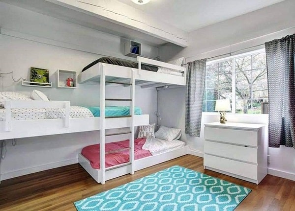 تصميم رقيق وبسيط لغرفة البنات الثلاث تو وضعه لتوفير ثلاث أسرة صغيرة باللون الأبيض مع فرش أنيق باللون الوردي الفاتح سرير الدرج يعلوه السرير الثابت ثم.
