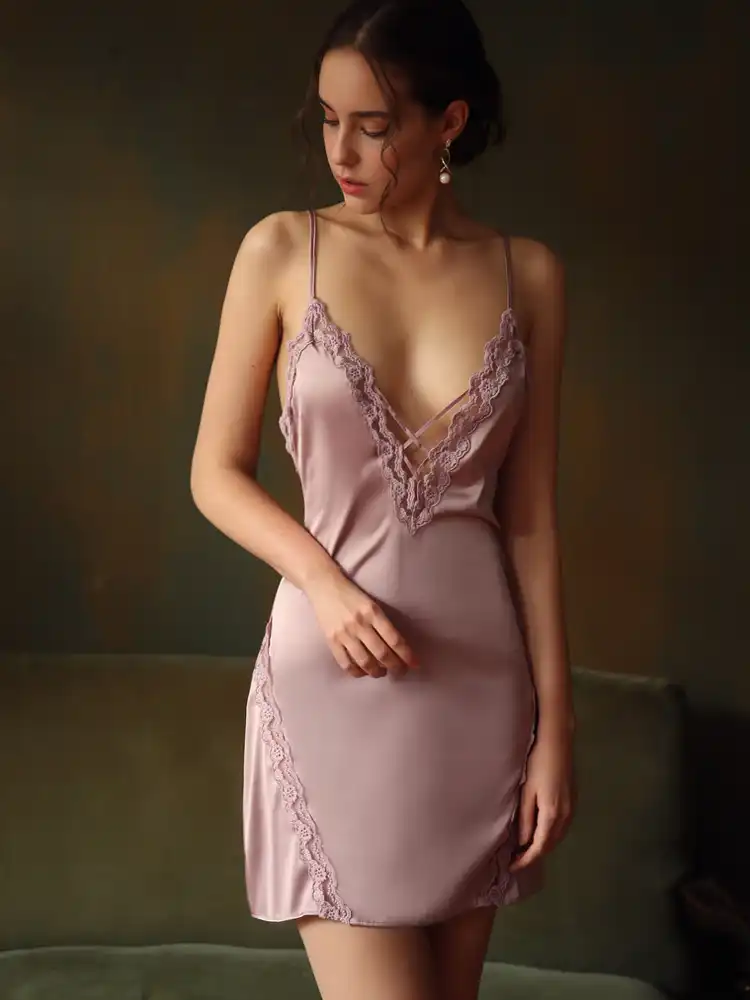أطقم قمصان نوم نسائية مثيرة قميص نوم من الدانتيل مع فتحة رقبة على شكل حرف v ملابس نوم للاستراحة للسيدات قطعتين قميص نوم