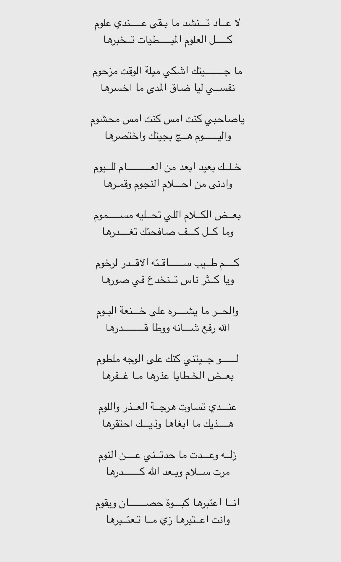 قصيدة لاتشغليني ياعيوني عن النوم. لا تشغليني ياعيوني عن النوم مبطي وانا مو مهتني في رقادي مليت اقاوم لذة النوم واقوم أكامد اجروحي وجدد ضمادي ماراح راح وماحصل كان مقسوم. أكتب كثيرا عبارات عن النوم ثم أنام فالنوم هو ثاني هواياتي.